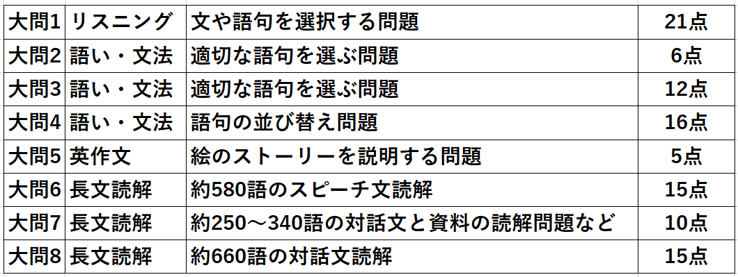 英語の室内内容等配点の内訳は